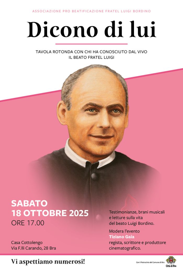 L’Associazione Pro Beatificazione fratel Luigi Bordino, nell’anno in cui ricorre il decennale della beatificazione (2 maggio 2015), organizza una tavola rotonda dal titolo “Dicono di lui”. L’incontro vedrà la partecipazione e il racconto di alcune persone che hanno conosciuto dal vivo fratel Luigi e cercheranno di tratteggiare alcuni aspetti del religioso che da alpino ha partecipato alla Campagna di Russia e successivamente ha consacrato la propria vita a Dio, a beneficio delle persone bisognose al Cottolengo.